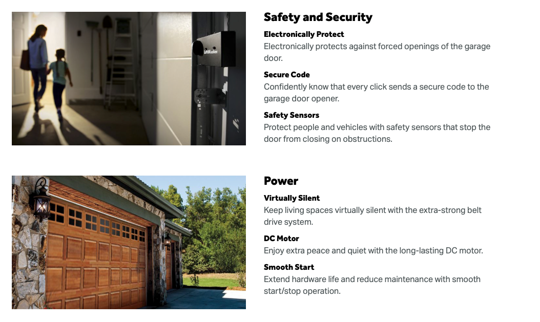 - Ultra-quiet DC motor and strong belt drive system ensures for comfortable living spaces near the garage.